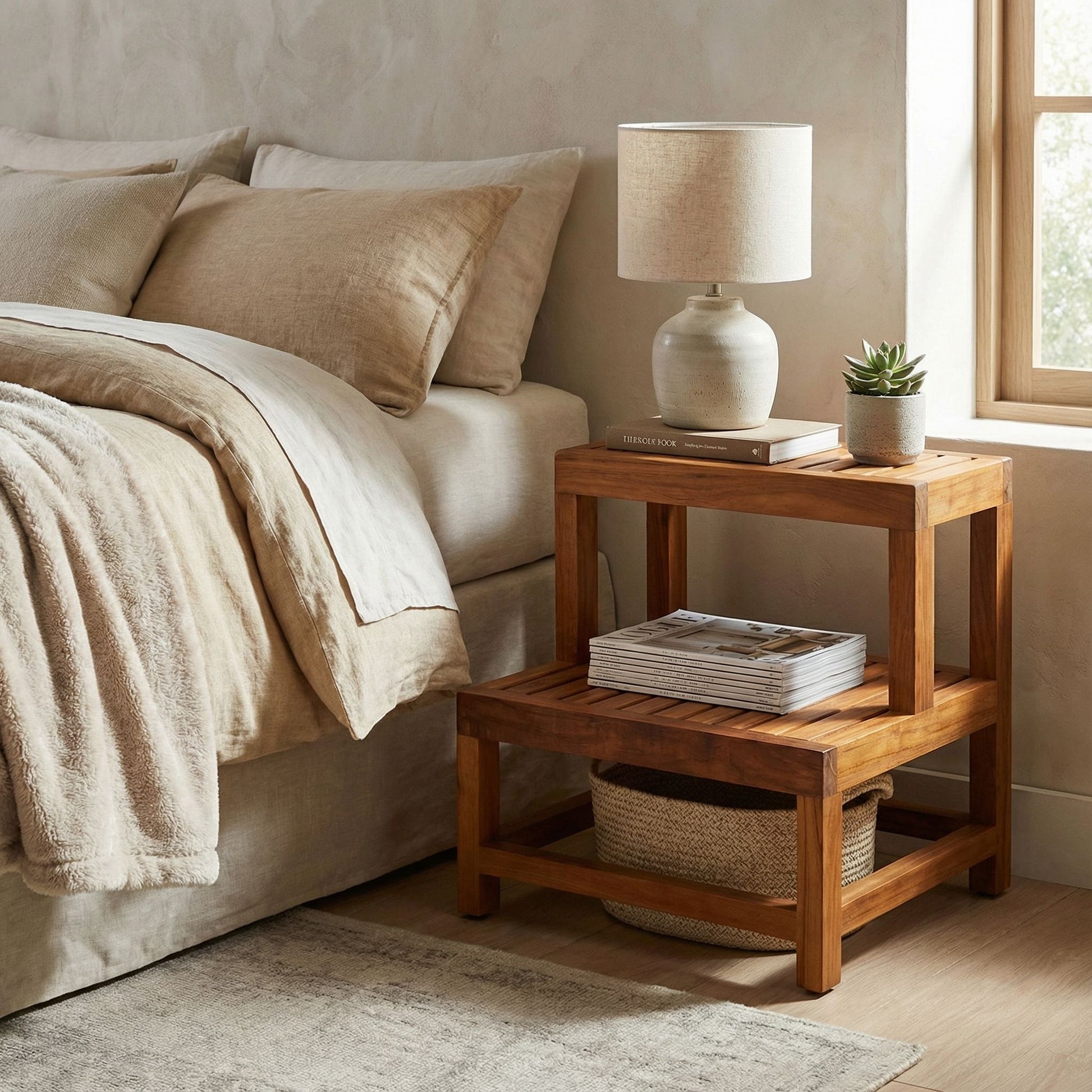 The Biggie End Table takes your home to a new level of style and function. Featuring tiered shelving and a large surface area, this end table offers the perfect amount of space for decorative items as well as drinks. This unique table will surely add a decorative element to any room. Made of responsibly harvested solid teak wood (tectona grandis), it has a high degree of natural durability. The high oil content works as a natural moisture barrier as well as giving it a rich warm coloring.